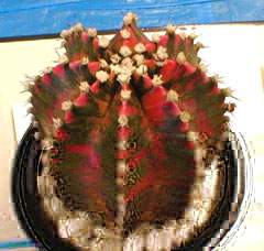 Vatanabe imported from Germany 300 seeds and in 1937 got seedlings which 4 years later grew into plants that gave in total 10,000 seeds. In 1941 when seedlings came up there were 2 pink cactuses among them. Vatanabe implanted them, after a short period cut them into several parts and implanted them again. As a result he got a bright red "hibotan" and motley "hibotan nishiki". "Hibotan" has no chlorophyll and does not grow on its own roots. But if implanted it gives lots of shoots which are easily implanted too. "Hibotan" likes a lot of sun. It becomes especially beautiful in winter. Some companies specialized in cactuses offer it under the name of "Ruby ball". "Hibotan nishiki" contains chlorophyll and grows on its own roots. It has red, yellow, green and blue colors mixed together Lately the Japanese cactus growers managed to get a number of other colored cactuses including Rebutia minuscula and Chamaecereus silvestrii - without chlorophyll, yellow. In 1968 the Japanese company "Chuo Commercial K. Ltd" offered at very high prices a number of cultivated cactuses including the following: