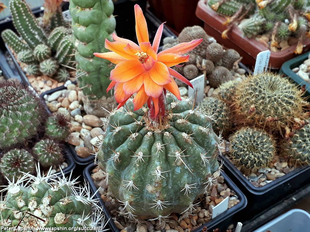 Имеет около 15 бугорчатых ребер. Молодые растения не имеют четких ребер и похожи на неопрятный Гимнокалициум. Колючек в ареоле 10-20. Цветки оранжевые разной насыщенности от желтоватых до почти красных.