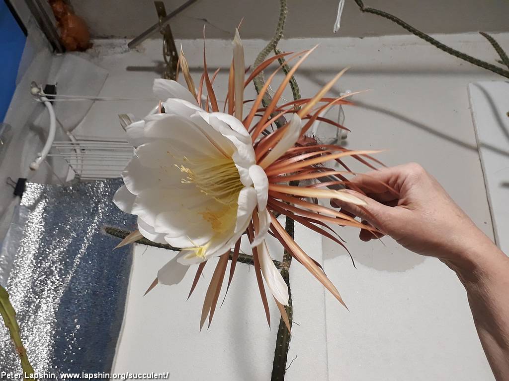 Цветки ночные, около 20 см в диаметре, на вызревших побегах прошлого года, внешние лепестки коричневатые, внутренние желтоватые, имеют сильный приятный запах.