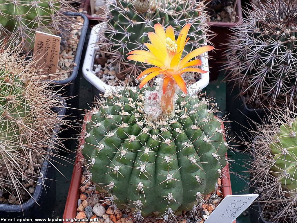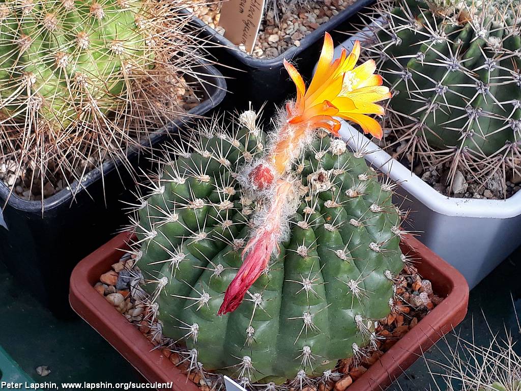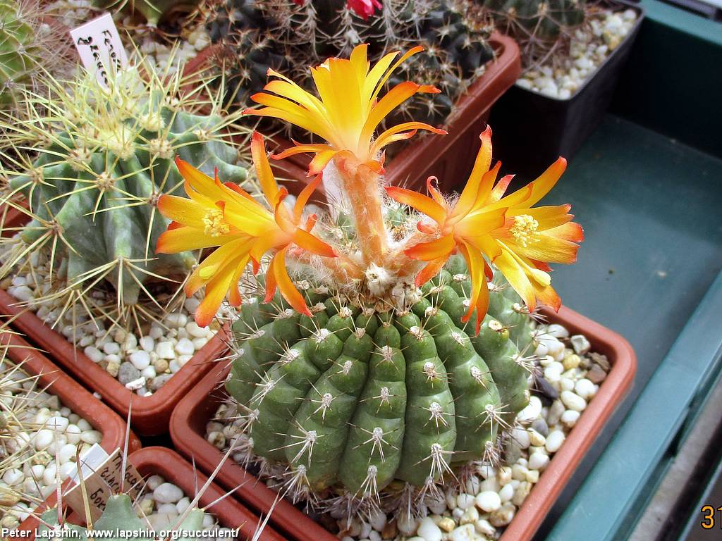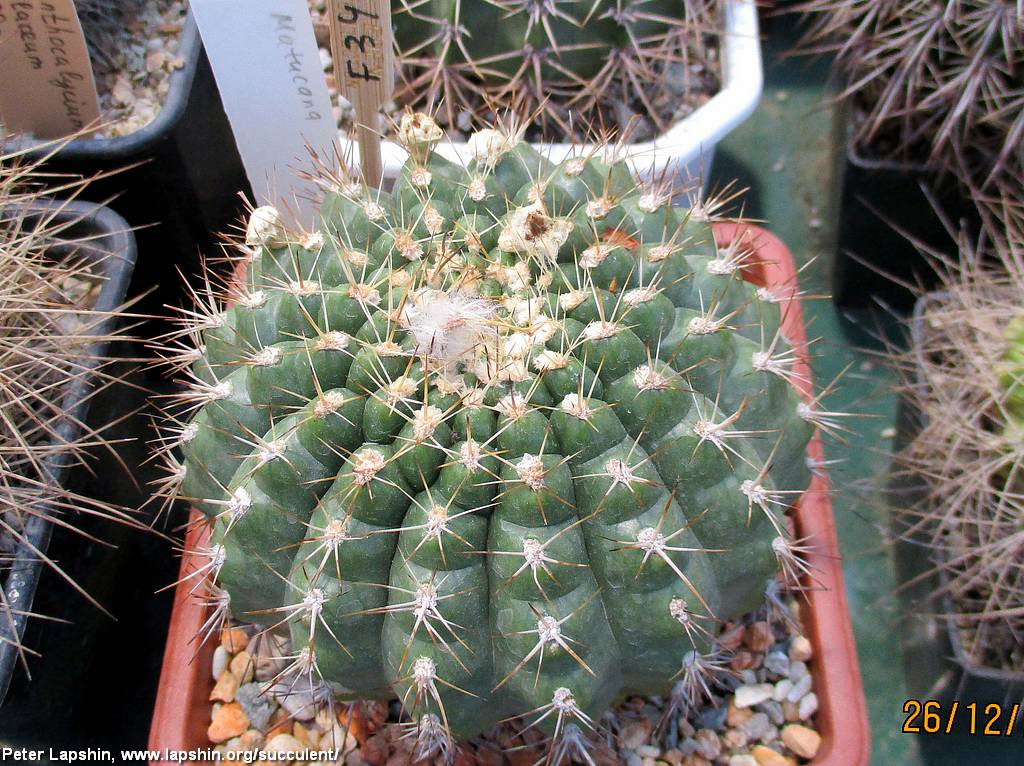 Тело до 20 см, шаровидное одиночное, ребра хорошо заметные, 15-25 шт, бугорчатые, колючки светлые.
