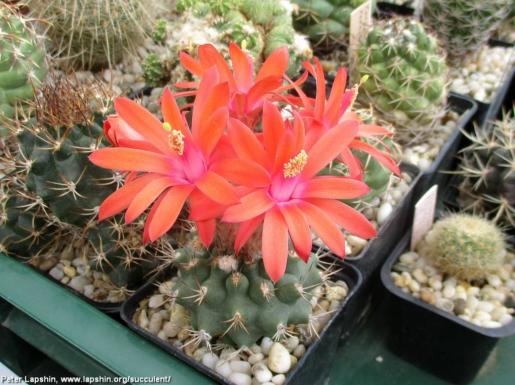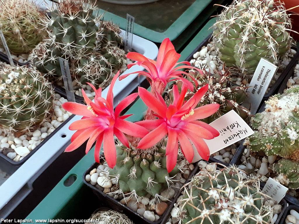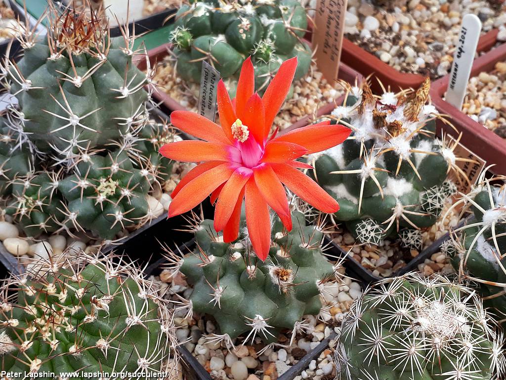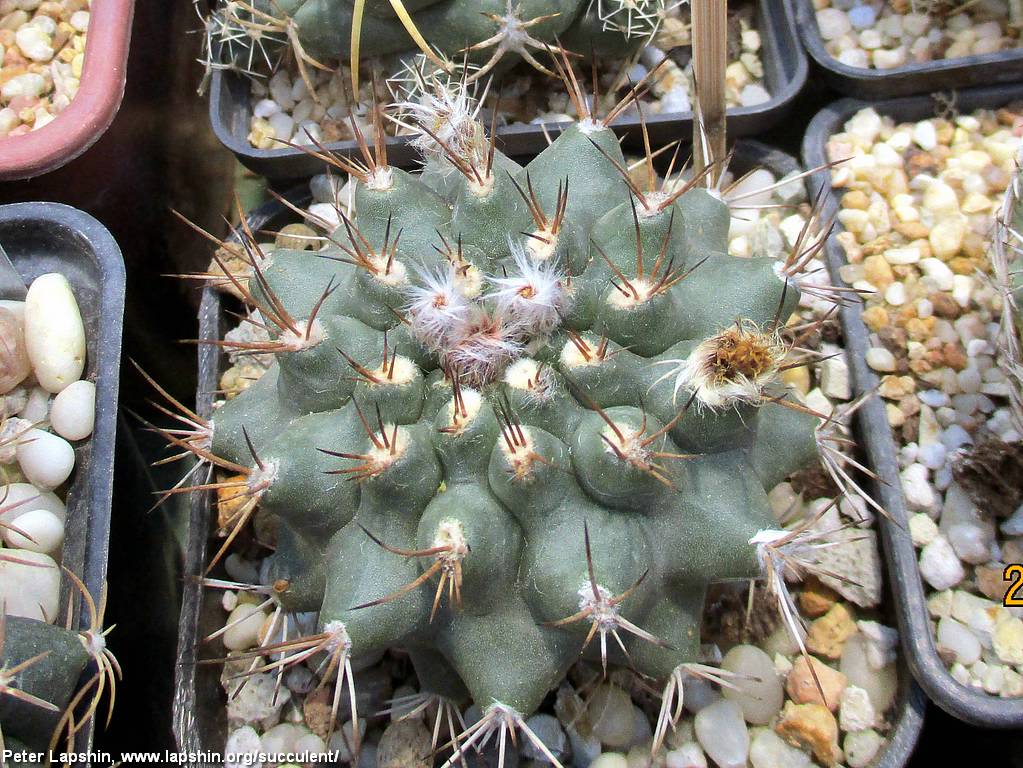 Колючки: центральных 1-4 черных, с коричневыми кончиками, длиной 0,5-1 см, позже достигают 6-8(-9) см в длину и слабо закручены, радиальных 8, темно-коричневых.