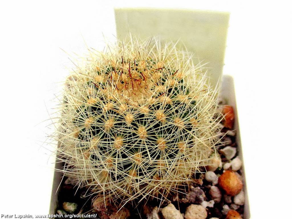 Стебель короткоцилиндрический, густооколюченный. Шипы очень многочисленные, полностью покрывающие тело. Колючки щетинистые, гибкие, короткие, белые или кремово-желтые с более темными кончиками.